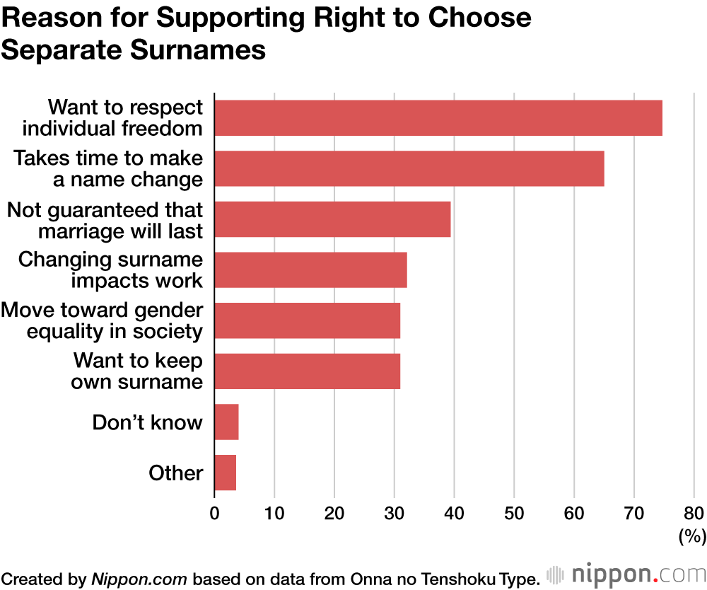 At 74.7%, the most common reason for supporting the right to choose separate surnames was wanting “to respect individual freedom.” Many also mentioned the practical issues of it “takes time to make a name change,” such as for bank accounts and driving licenses, as well as it “impacts work.”