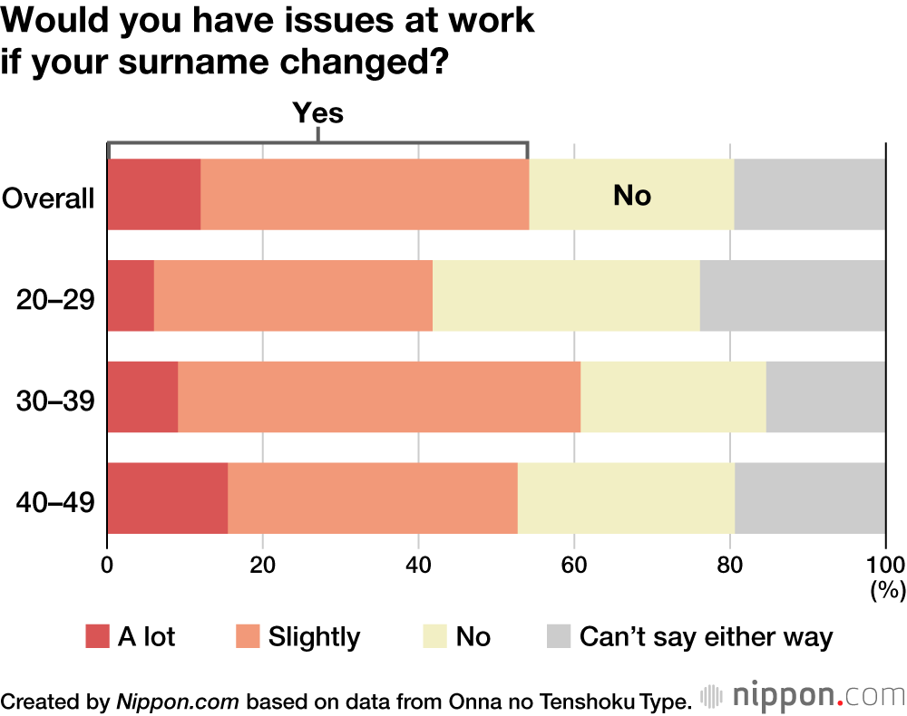 Respondents were also asked if they would have issues at work if their surname changed, to which a total of 54.3%, including those who said, “a lot” and “slightly,” answered that they would; this was more than twice the 26.3% who said they would not have any issues. The main problems that they cited included it would be “necessary for people to change what they called me,” “need to change my business card and email address,” and “business contacts need to be notified.”