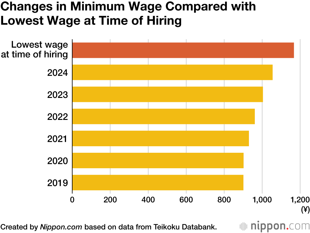 According to a survey of 27,093 companies in Japan conducted by Teikoku Databank from mid- to late September, the average lowest hourly wage when hiring regular or nonregular employees was ¥1,167, which was ¥112 higher than the national weighted average of ¥1,055 under the revised minimum wage implemented in October.