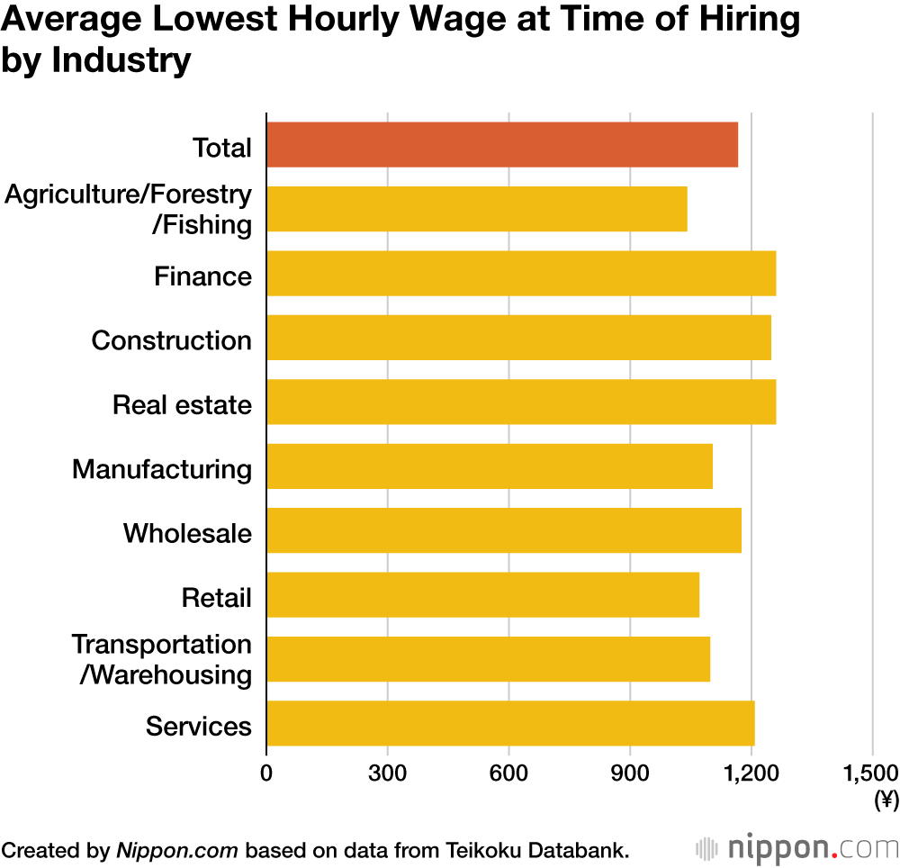 By industry, the lowest average hourly wage at the time of hiring was highest in the finance and real estate sectors at ¥1,261, followed by the construction sector at ¥1,249, and the service sector at ¥1,208.