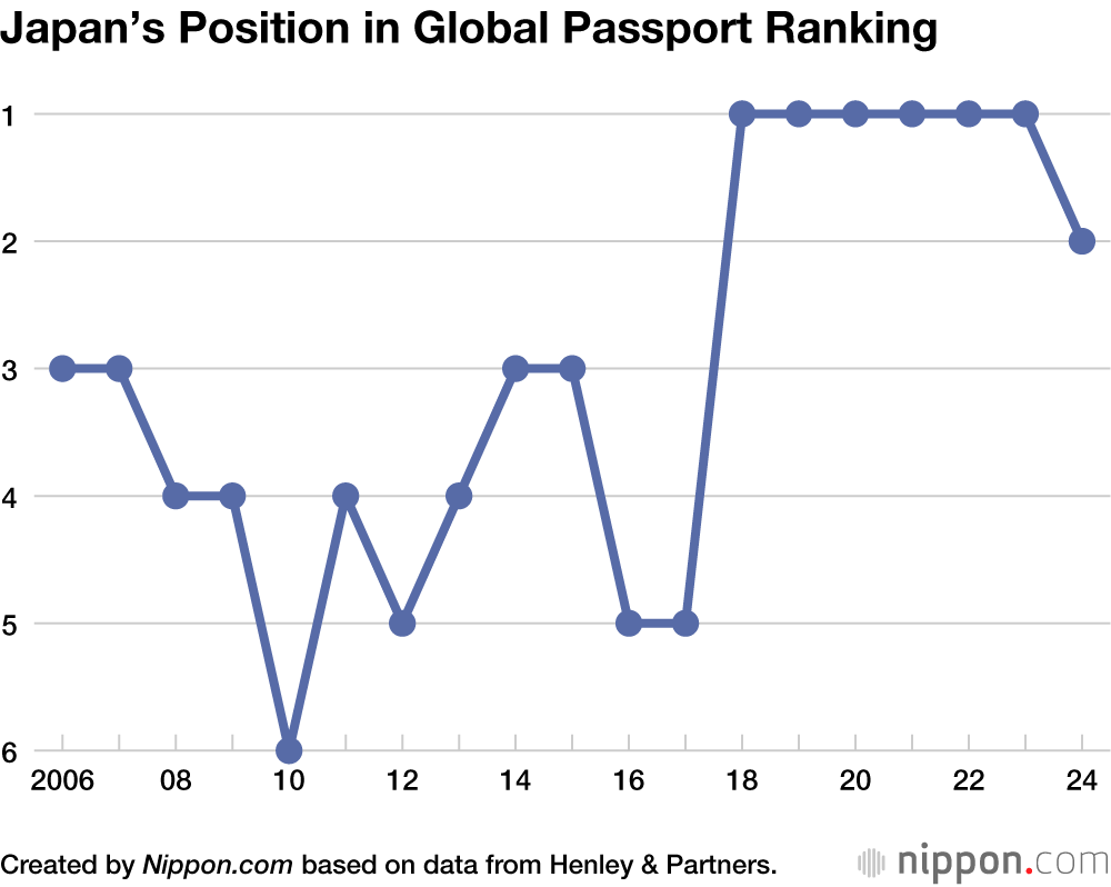 Japan slipped from top to second position in 2024 in the Henley Passport Index, which ranks passports by how many countries and regions around the world people holding them can visit without a prior visa. It had been first for six years from 2018, but Singapore moved ahead to become the sole leader in 2024. The ranking is created by the British consulting firm Henley & Partners, based on data from the International Air Transport Association concerning 199 countries and regions and 227 travel destinations.