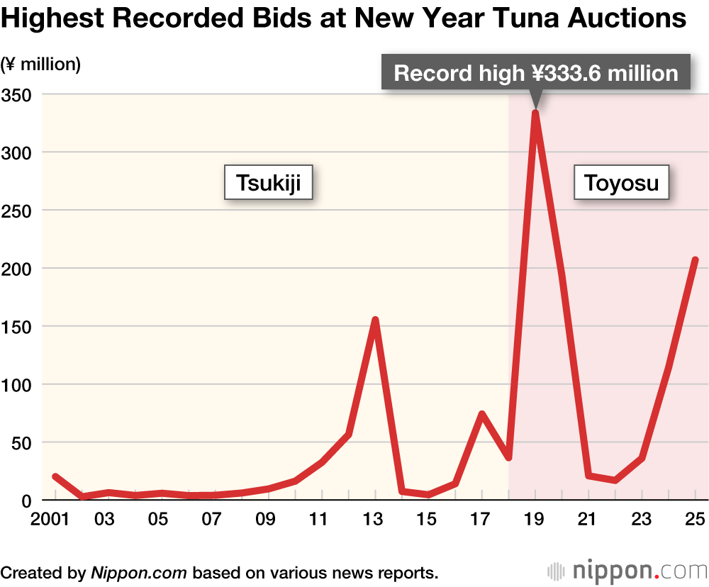 A look back at trends in prices since 2001 showed that up to 2010, it was unusual for a bid to exceed ¥10 million. In 2013 though, the price hit ¥155.4 million, taking it above the ¥100 million mark for the first time. Since then, these bids have been gaining public interest as a kind of New Year’s tradition. The highest price to date was ¥333.6 million in 2019 at the first New Year’s auction following the market’s move from its traditional Tsukiji site to Toyosu.