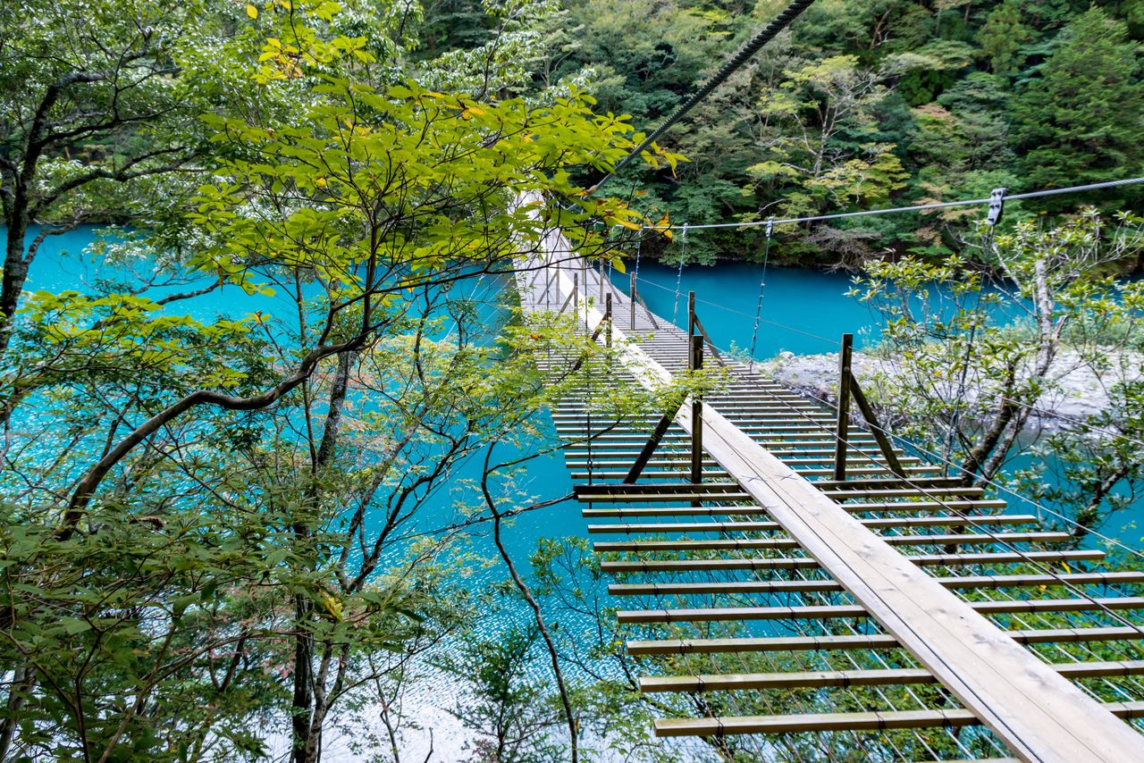This suspension bridge, located at the northern tip of Shizuoka Prefecture, spans Sumata Gorge, which is the gateway to the Southern Alps. Visitors crossing the bridge can enjoy the view of the mysterious emerald-green lake below.