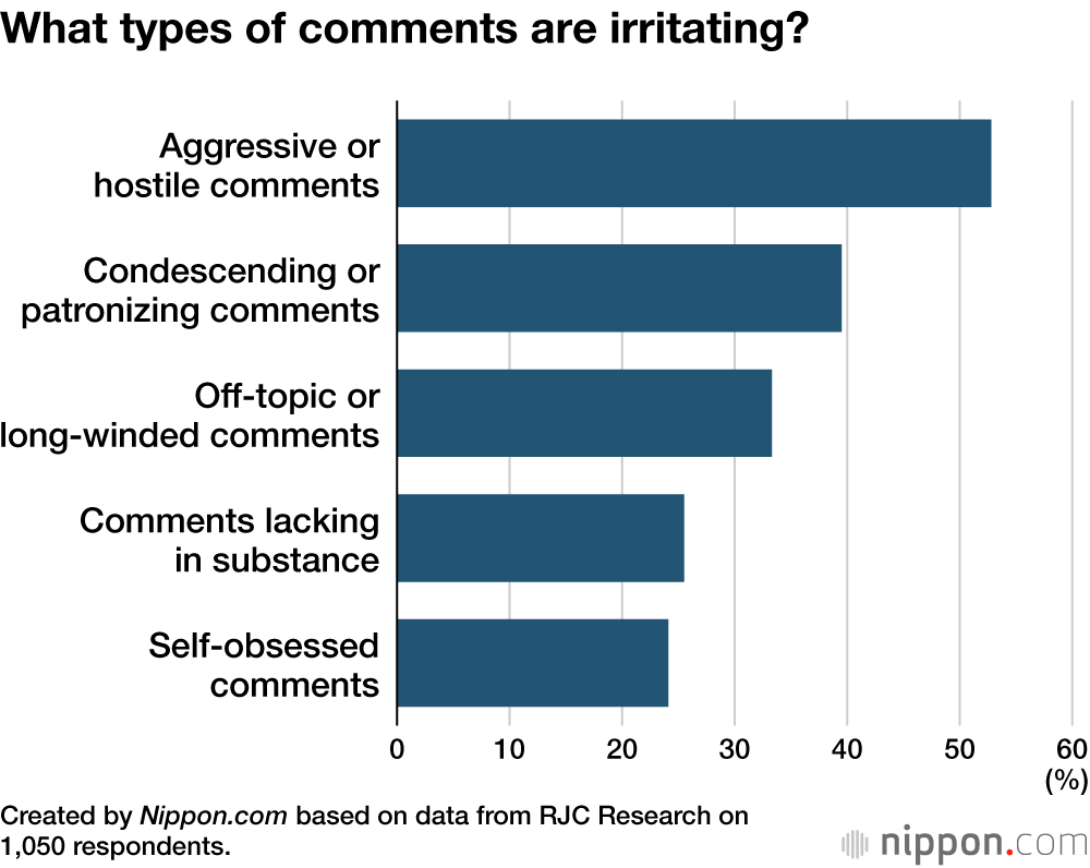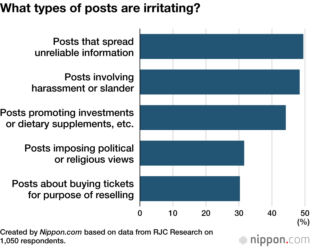 When asked about what types of posts are irritating (with multiple answers allowed), the most commonly mentioned problem, at 50%, concerned the spread of unreliable information such as false rumors, fake news, and gossip. This was followed by the problem of harassing or slanderous posts. A separate question regarding types of annoying comments or reactions (also with multiple answers allowed) showed that the most commonly cited problem was aggressive comments, mentioned by 52.8% of the respondents.