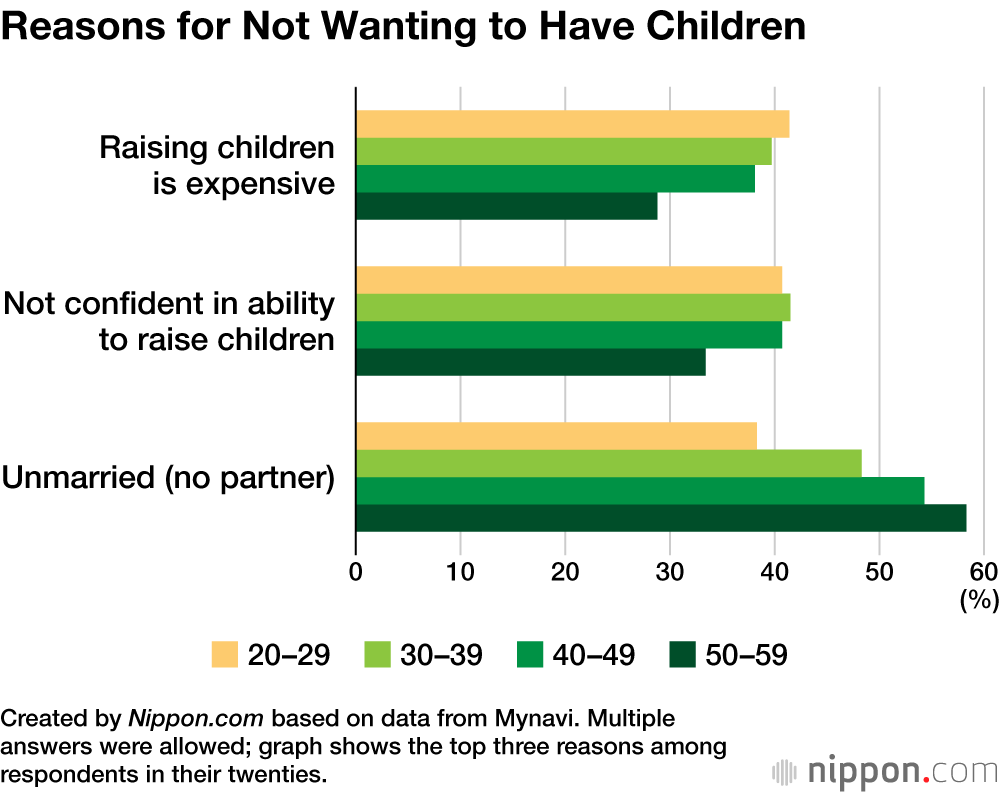 When asked to explain why they did not want to have children (with multiple answers allowed), the most common reasons for people in their twenties were the expense of raising children and a lack of confidence in their ability to raise a child, mentioned by 41.1% and 40.7% of the respondents, respectively. A representative from Mynavi saw the results as an indication that “economic insecurity may be limiting the desire to have children.”