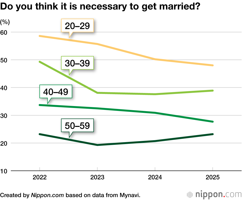 The survey also asked unmarried respondents about their views on marriage. The results show that 48.0% of people in their twenties, 38.9% of those in their thirties, 27.7% of those in their forties, and 23.2% of those in their fifties view marriage as something they consider personally necessary. The percentages for those in their twenties and thirties were more than 10 percentage points lower than the results in 2022, indicating a significant shift in attitudes toward marriage.