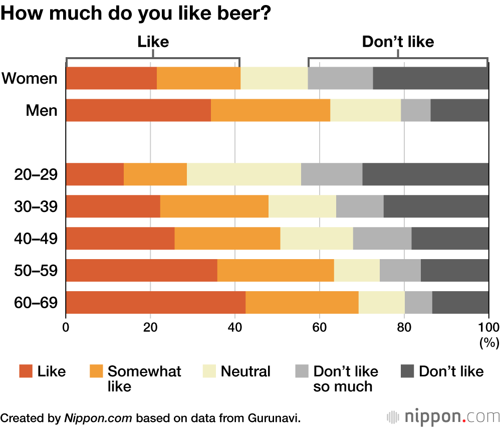 A clear gender gap could be seen, with 41.3% of women and 62.5% of men in total saying they “like” beer. The overall total for those in their twenties who “like” beer was 28.6%, and this percentage rose along with respondents’ age, reaching a high of 69.2% for those in their sixties.