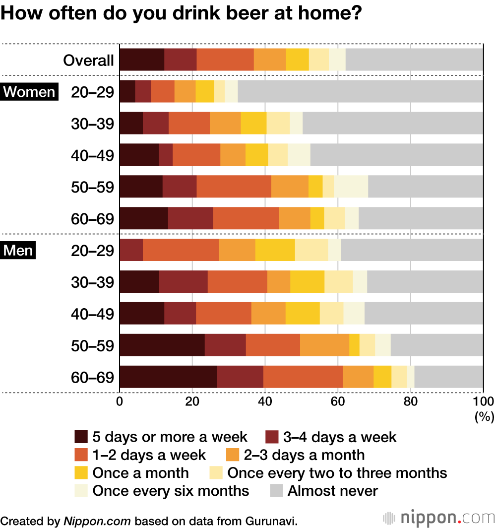 Looking at how often people drank beer, those who drank at a bar/restaurant most commonly did so “once a month” (14.5%), while the most often for those who drank at home was “one to two days a week” (15.7%). The “love for beer” correlated to consumption, with men drinking beer more frequently than women, and also older people doing so more often than younger generations. While there were no men in their twenties who drank beer “five days or more a week” at home, this rose to 23.4% for men in their fifties and 26.8% for those in their sixties.
