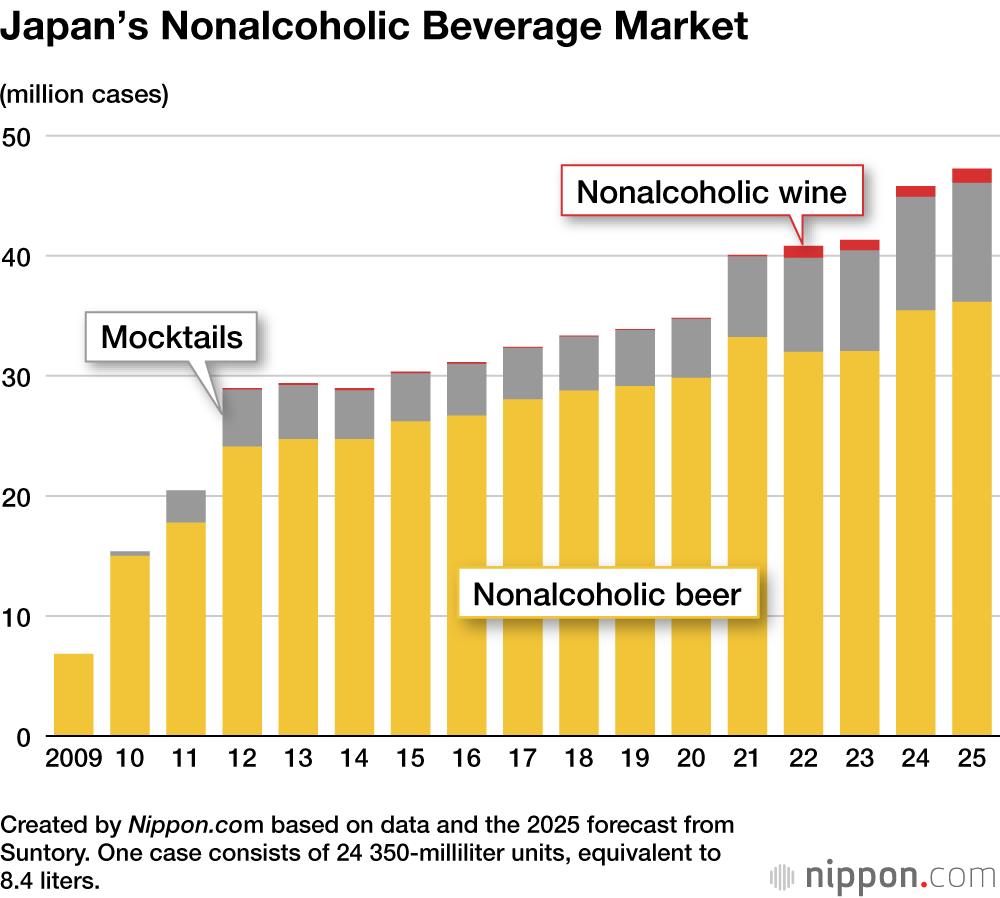 According to estimates by beverage maker Suntory, 46 million cases were sold in Japan’s nonalcoholic beverage market in 2024. This was an 11% increase year on year and, compared to a decade ago, a 1.6-fold growth in the scale of the market. The market is forecast to expand to 47 million cases in 2025.