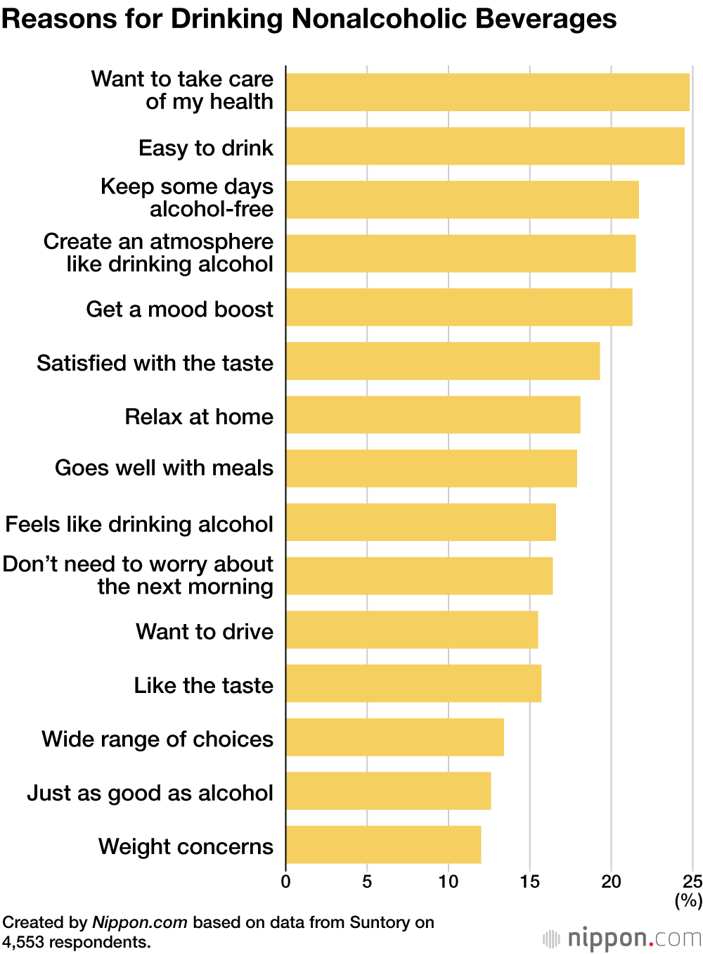 When the 4,553 respondents who said they drink “once a month or more” were asked why, the top two reasons were “want to take care of my health” with 24.8%, and “easy to drink” at 24.5%. Reasons such as “don’t need to worry about the next morning” (16.4%) and “want to drive” (15.8%), suggesting the respondent actually wanted to drink alcohol, had relatively lower response rates.