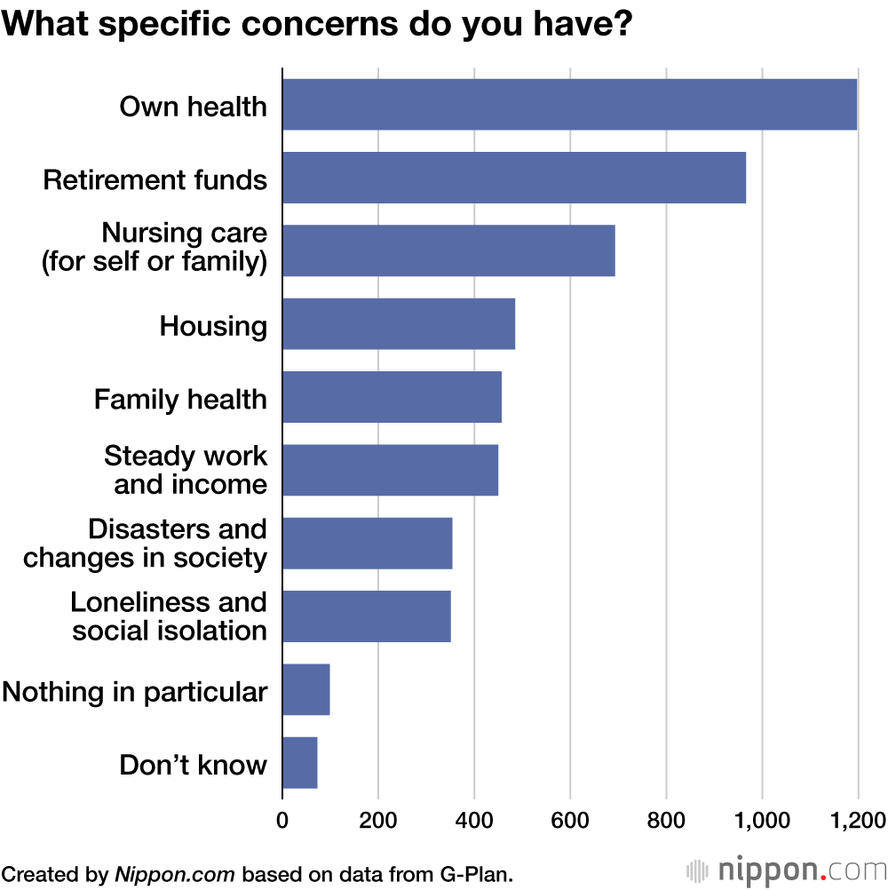 The most common specific concern held by 1,197 respondents was “health.” This was followed by 966 worried about “retirement funds,” and 693 concerned about “nursing care.”