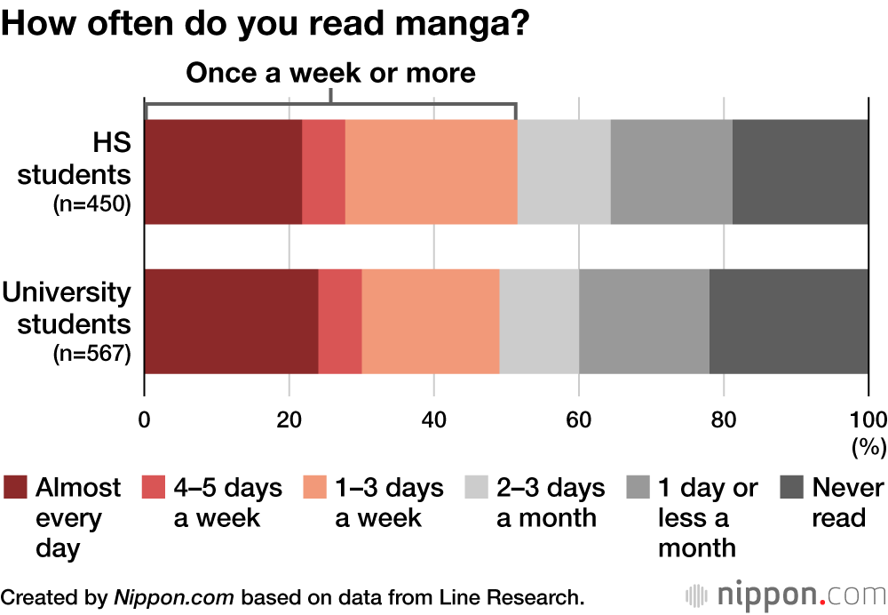 A survey in Japan, conducted in early August by Line Research and aimed at students aged 15 to 25, revealed that 51% of high school students and 49% of undergraduate and postgraduate students read manga, including all kinds of print and digital comics and magazines, “once a week or more.” Meanwhile, 19% of high school students and 22% of university students “never read” manga.