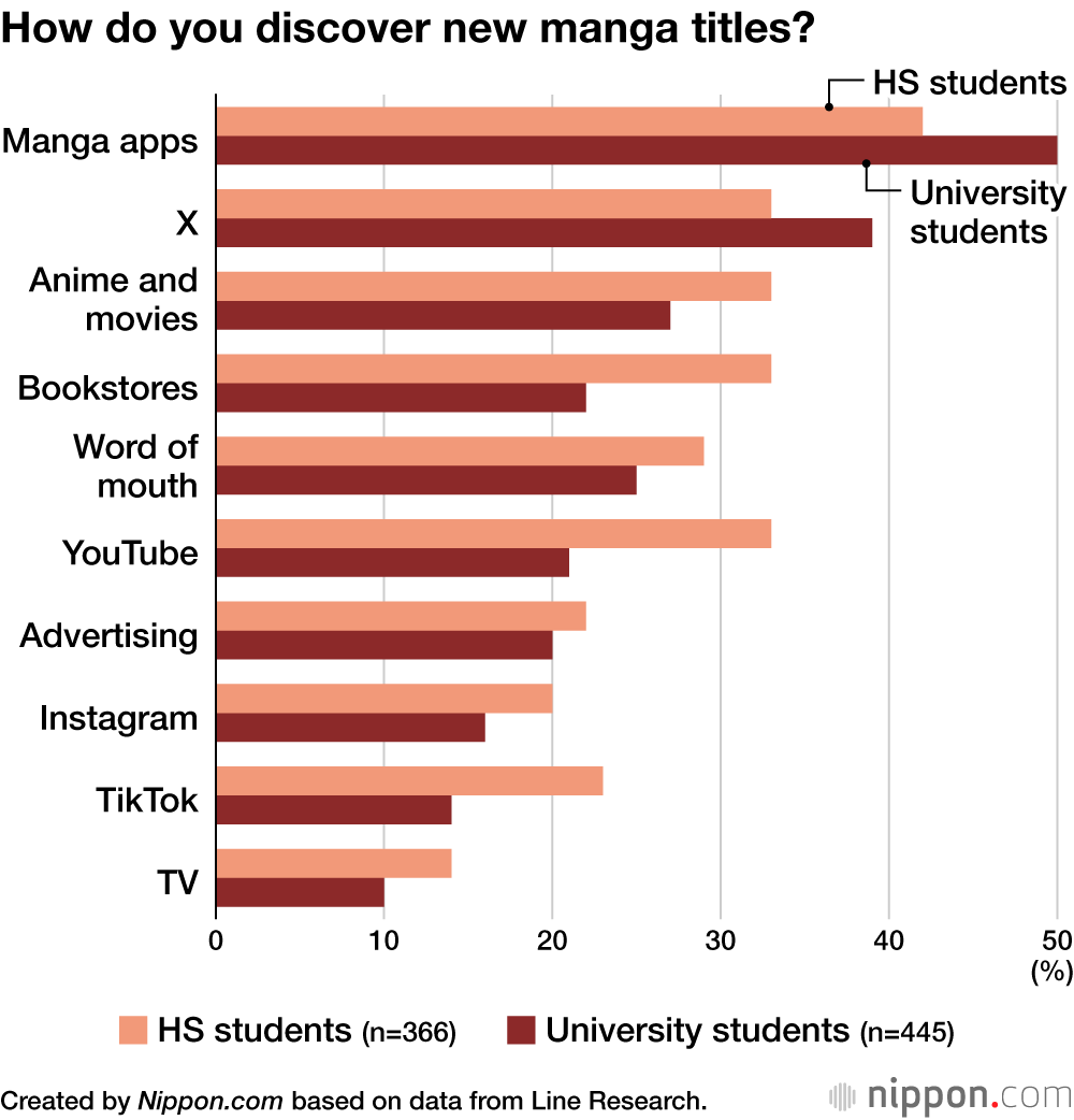 Among those who do read manga, the most common way they use to “discover new titles” is through manga apps, with 42% of high school students and 50% of university students using them. But even though manga can be read on smartphones these days, bookstores still have a surprisingly strong hold on high school students, with 33% finding new titles there.
