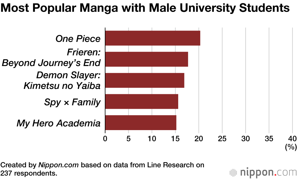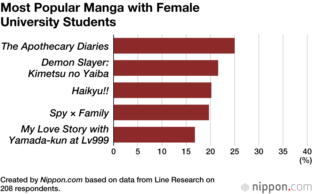 Female university students ranked The Apothecary Diaries highest, while for male university students One Piece came top. Demon Slayer: Kimetsu no Yaiba is also highly popular among university students, ranking second for women and third for men.