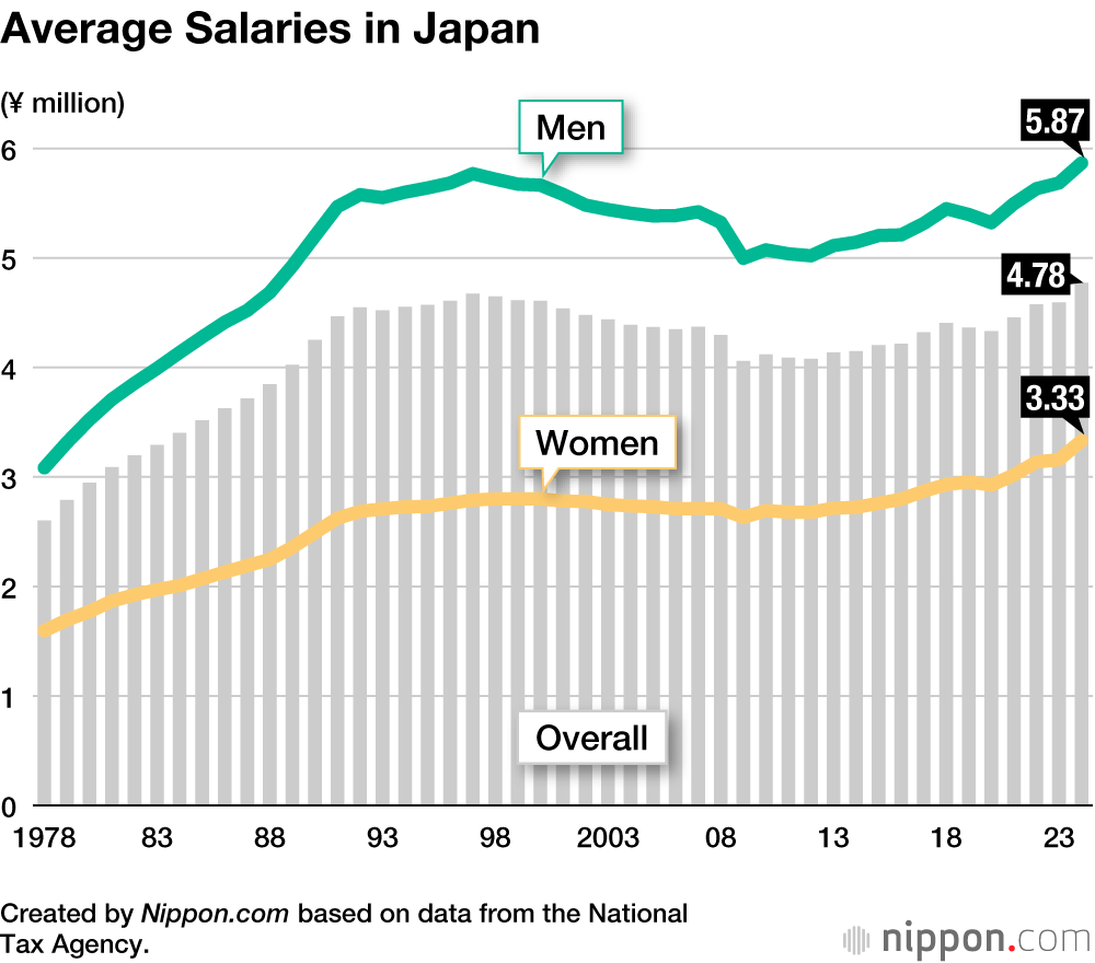 A survey of private-sector salaries conducted by the National Tax Agency found that the average salary earned by workers in the private sector increased in 2024 by 3.9% year on year to ¥4,775,000, rising for the fourth consecutive year. This sets a new record, ahead of the ¥4,670,000 average in 1997, as it reaches the highest point since statistics were first kept in 1949. Contributing factors included corporate efforts to secure staff amid the labor shortage and the rise in the minimum wage.