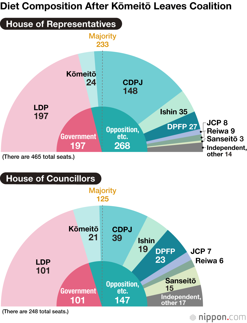 The coalition was already in a tenuous position, holding less than a majority of seats in both houses of the Diet, but now that it stands on its own, the LDP sees its minority position undermined still more. Takaichi has expressed hopes for an expanded coalition including the Democratic Party for the People, but even this pairing would not build the majority in both houses needed to pass legislation on its own.