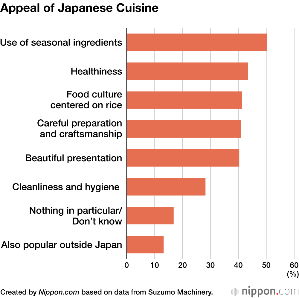 When asked to explain the appeal of Japanese cuisine, the most common response was the “use of seasonal ingredients,” at 50.2%. “Craftsmanship” and “appearance” were both at around 40%, showing that Japanese people feel the charm of the country’s food lies not only in its taste, but also in its aesthetics and cultural aspects.