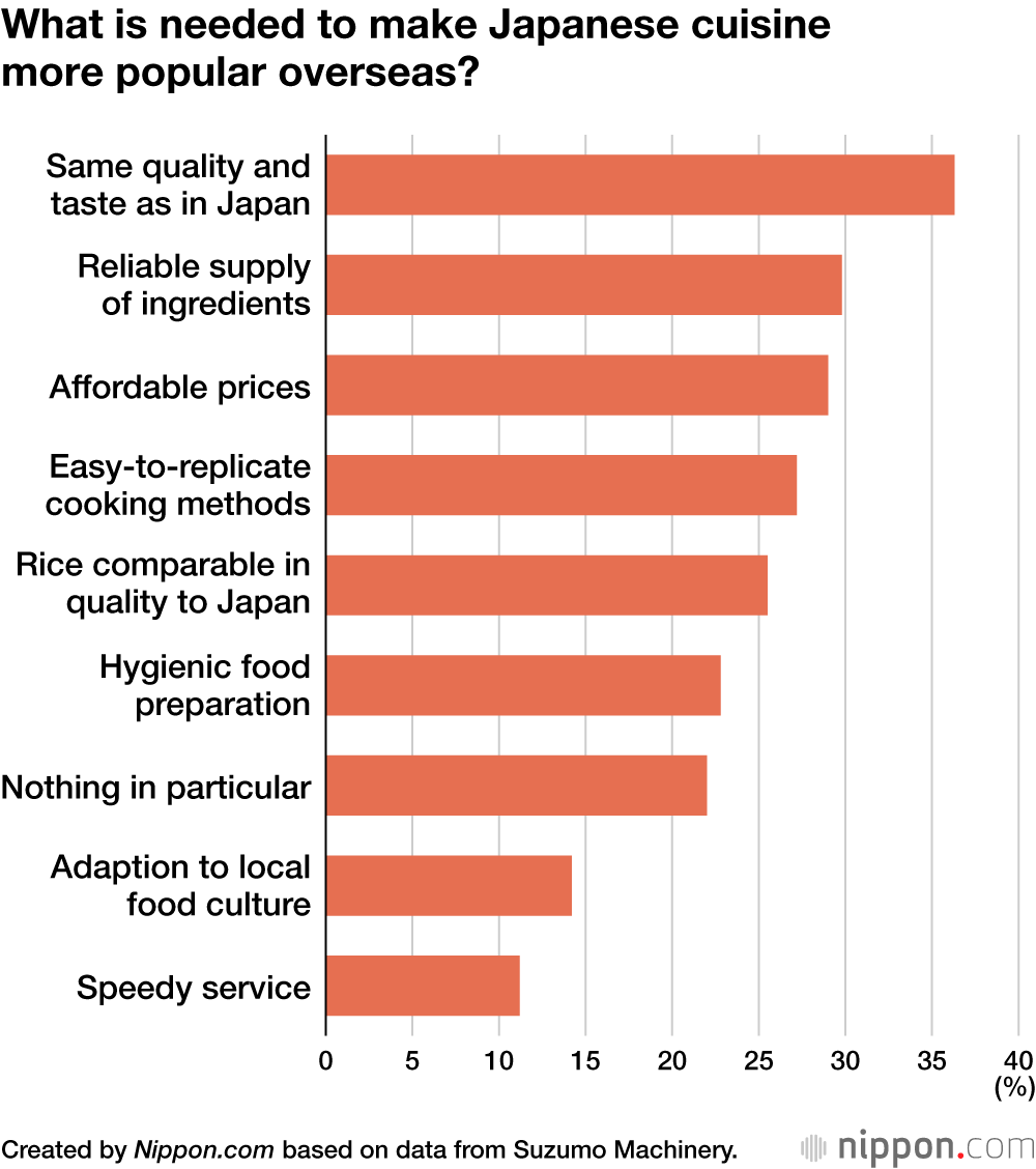 The survey also asked about what was necessary to expand enjoyment of Japanese cuisine overseas. The most common response, at 36.3%, was to “reproduce the same quality and taste as in Japan.” At the same time, the results show that many think Japanese food will become more popular overseas by aligning with local preferences, such adopting cooking methods that are easy to replicate locally or adjusting to the local food culture.