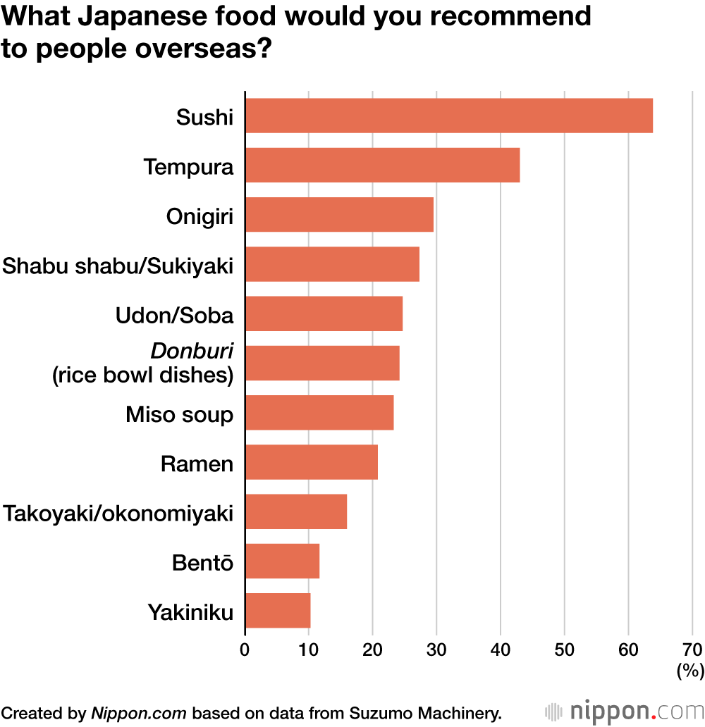 When Japanese people were asked what Japanese food they would recommend to people living outside of the country, the top response by far was sushi, at 63.8%, followed by tempura at 43.0%.