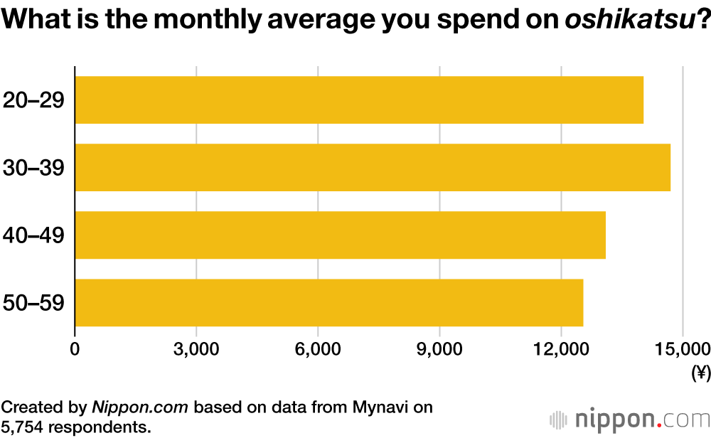 When respondents engaged in oshikatsu were asked how much they spend per month on such activities, the overall average was ¥13,305. By age group, people in their thirties spent the most, with ¥14,692 and then those in their twenties with ¥14,026.