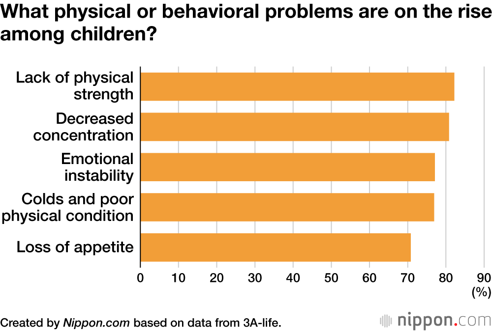 Teachers surveyed reported that these kinds of lifestyle changes are resulting in such problems as a lack of physical strength (82.2%), decreased concentration (80.8%), and emotional instability (77.1%).