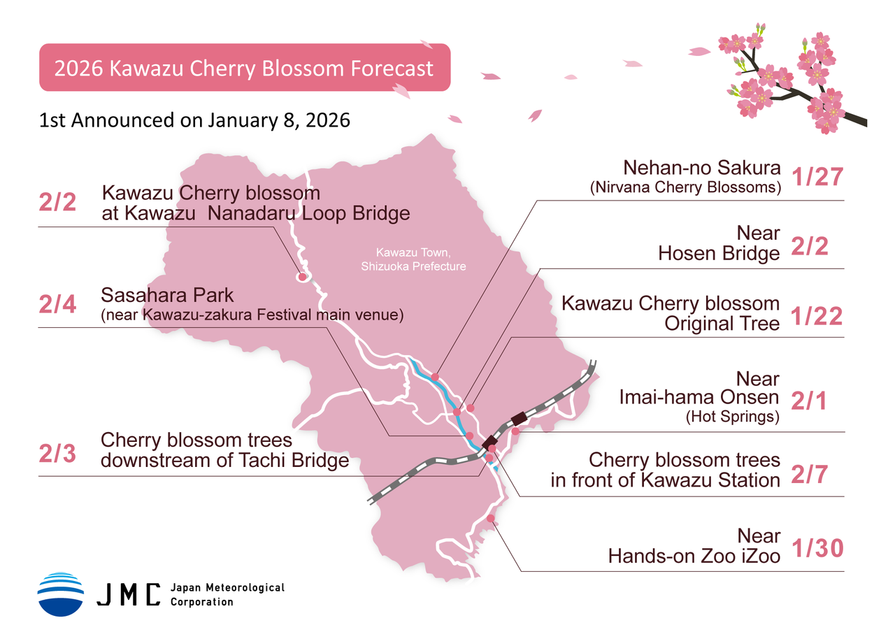 While Japan’s main cherry blossom season comes in spring, with the somei-yoshino, the kawazu-zakura variety flowers early, from late January. It takes its name from the Shizuoka town of Kawazu, where it originated. From 2026, the Japan Meteorological Corporation has started forecasts for these Kawazu cherry trees, as guidance for the many visitors who enjoy them.