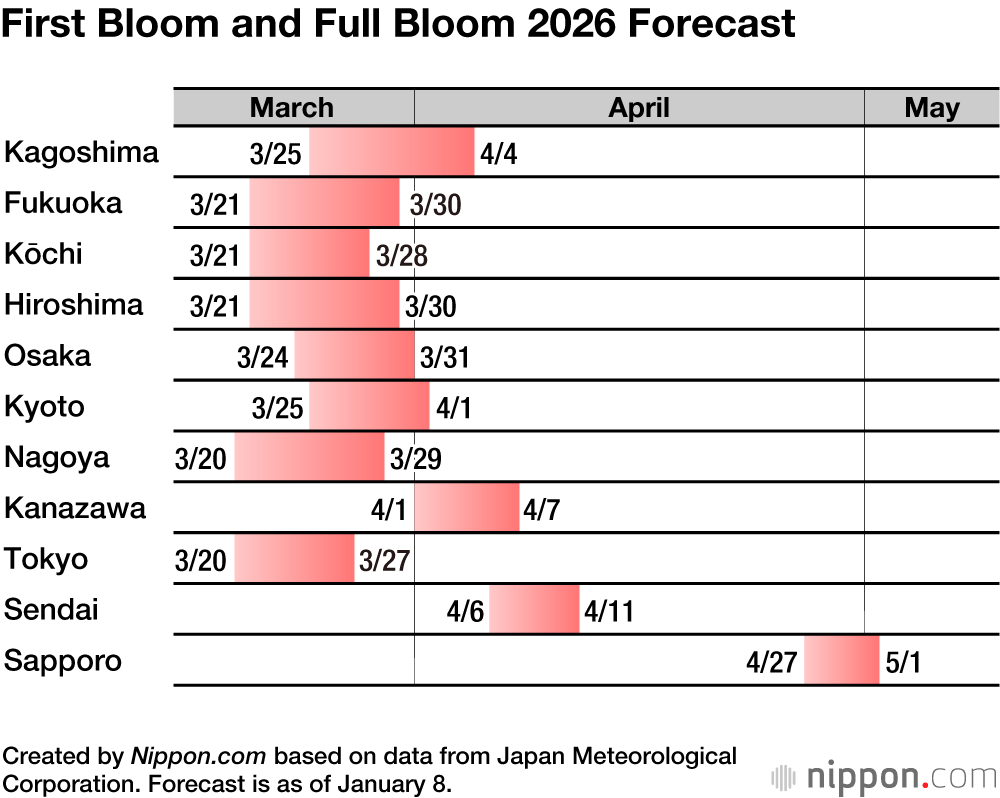 On January 8, the Japan Meteorological Corporation published its second cherry blossom forecast for 2026. Temperatures across the country are expected to be around the same as usual in January and February, but higher than usual in March and April, meaning that blooming will take place earlier than in a typical year.