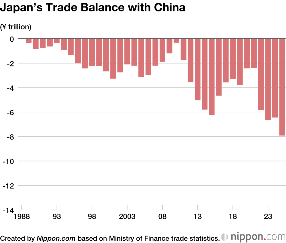 Exports to China dipped by 0.4%, while imports rose by 5.5%, due to increases for computers and smartphones. This led to a trade deficit of ¥7.9 trillion, rising in value again after falling last year.