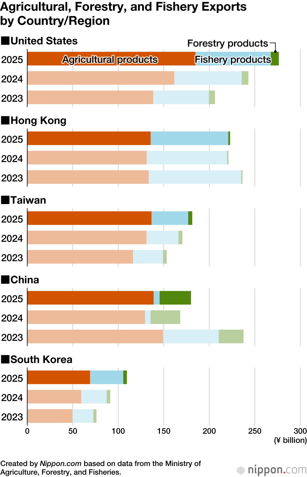 By country and region, exports to the United States came top with ¥276.2 billion, an increase of 13.7%. The negative effects of the Trump tariff hikes were limited, with exports of matcha and other kinds of green tea, as well as beef, seeing strong growth. Export to China also increased for the first time in three years, rising 7.0% to ¥179.9 billion. The impact of Chinese import restrictions on fishery products persisted, with only a slight uptick in this category, but there was strong demand for nishikigoi, logs, and beer.