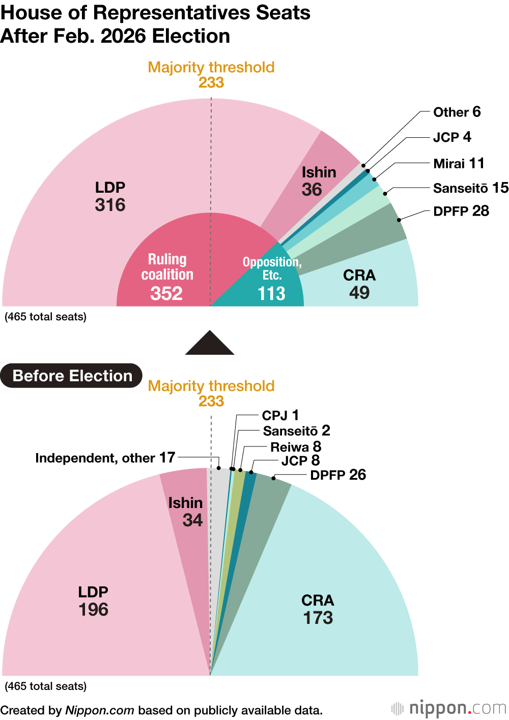 The election held on February 8, 2026, for Japan’s House of Representatives produced a dramatic reversal in fortunes for the ruling Liberal Democratic Party. Coming from a weakened position where it lacked a simple majority in the powerful lower house even with the added seats from its junior coalition partner, Nippon Ishin no Kai, the LDP ended election day with 316 out of the 465 in the chamber—more than two thirds of the total. The addition of Ishin’s 36 seats brings the coalition total to 352, a massive majority that allows the parties to override rejections of legislation in the House of Councillors, effectively allowing full control of the lawmaking process.
