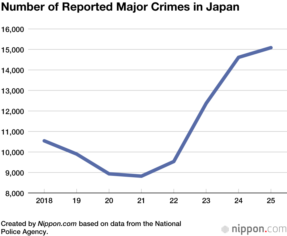 The number of reported crimes in Japan rose by 4.9% in 2025 to 774,142, according to statistics from the National Police Agency. This is higher than the total in 2019, before the COVID-19 pandemic.