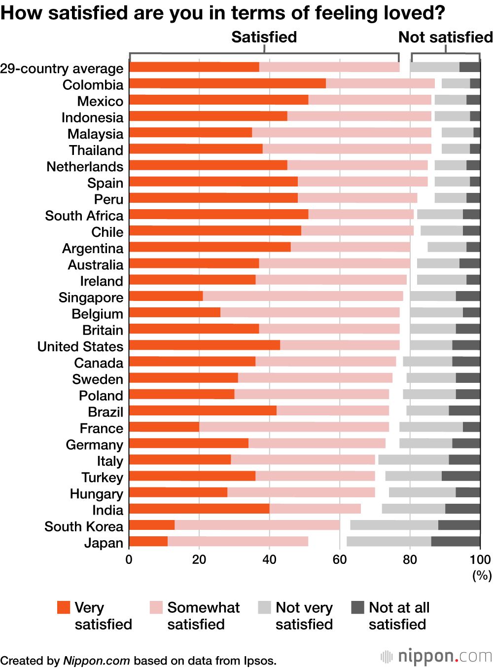 The Paris-based polling company Ipsos conducted a survey on attitudes toward romantic relationships, targeting 23,268 people across 29 countries. Japan ranked at the bottom for the category of “feeling loved,” with only 51% of Japanese respondents saying they felt very or somewhat satisfied in this regard. This was far below the 29-country average of 77%.
