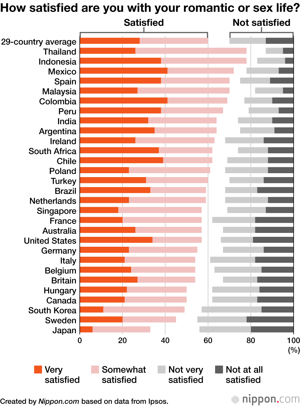 The percentage of people in Japan who said that they were very or somewhat satisfied with their romantic or sex life was 33%, a drop of 6 percentage points compared to the previous survey. This is just over half the overall average of 60%. Only 6% of Japanese reported being “very satisfied,” with Japan the only country below 10% for this answer. For the past four years, Japan has ranked last in terms of romantic satisfaction.