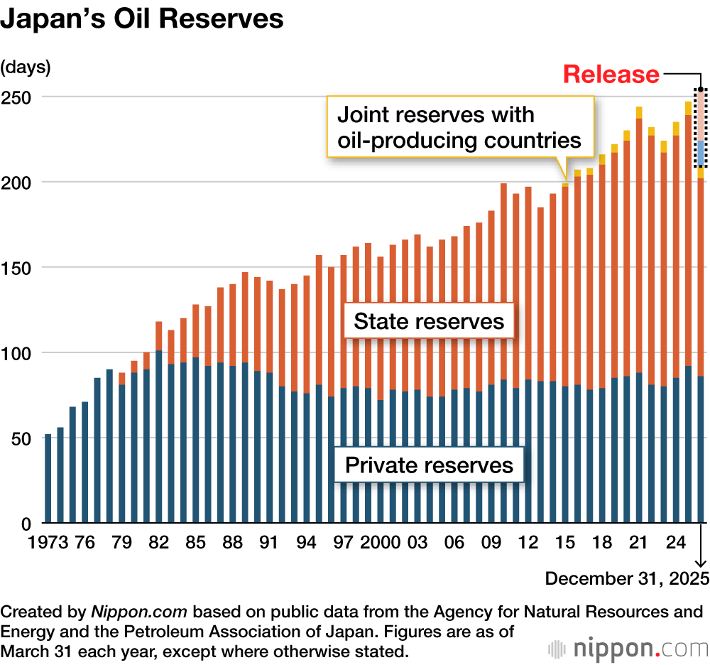 As of December 31, 2025, Japan’s state reserves held oil equivalent to 146 days’ consumption, while private-sector reserves held 101 days’ worth, and joint reserves with oil-producing countries had 7 days’ worth. This adds up to 254 days’ worth of oil overall, or 470 million barrels.