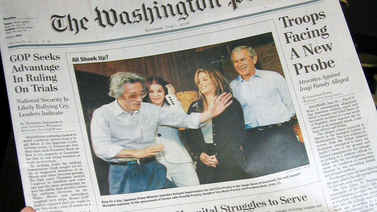 (Translated from Japanese. Banner photo: The front page of the July 1, 2006, edition of the Washington Post displays a photograph of Prime Minister Koizumi Jun’ichirō imitating Elvis Presley. © Jiji.)