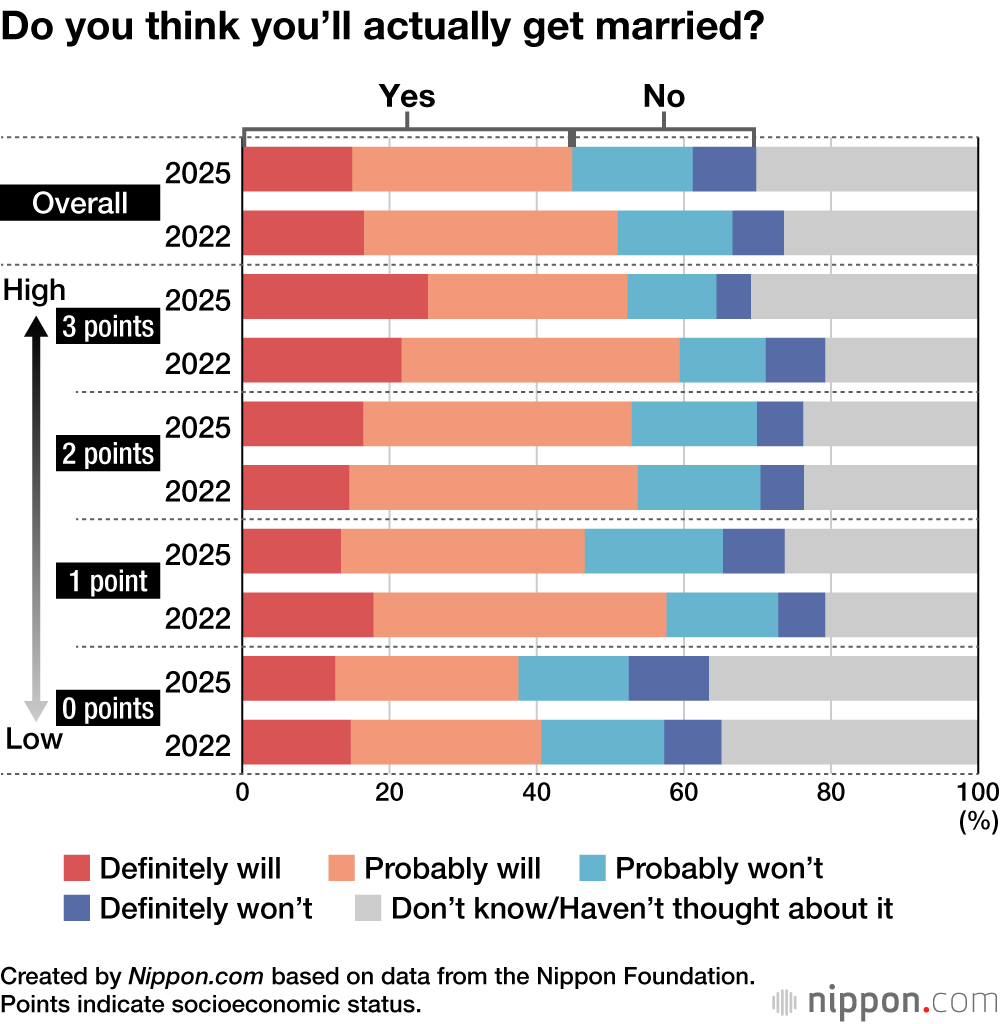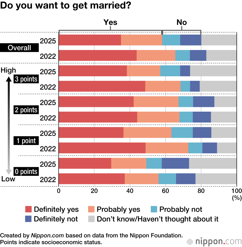 The proportion of respondents who either definitely or probably want to get married decreased by 7.4 percentage points, compared to the previous survey, for an overall level of 58.1%. When the respondents were subdivided into four categories according to their socioeconomic status, from 0 to 3 points (with greater affluence indicated by a higher score), those in the 0 category were below 50% in terms of intention to marry, at 49.2%, which was significantly lower than those in the other categories.