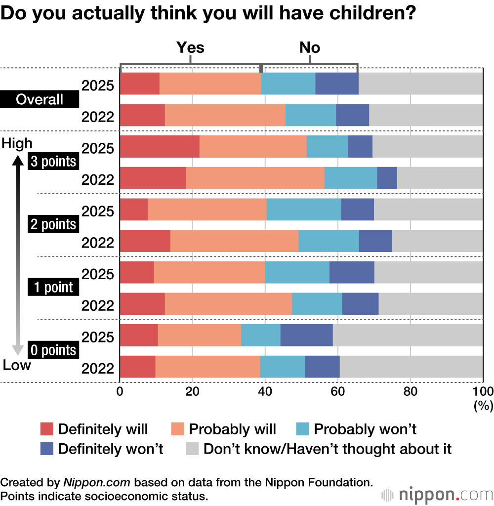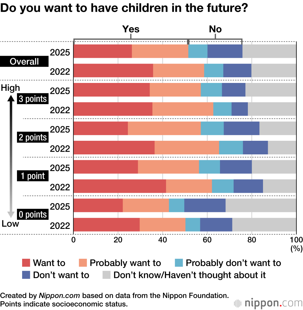 Japan is one of the countries in the world where population decline and aging are progressing most rapidly. The latest installment of an ongoing survey project of the Nippon Foundation asked teenagers aged 17 to 19 about life goals, such as marriage and raising children. The survey was conducted from late November to early December 2025, and is compared here to a survey on the same topic conducted in December 2022.