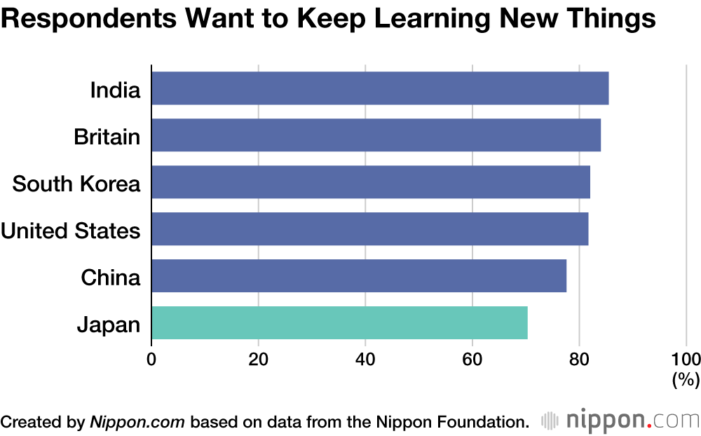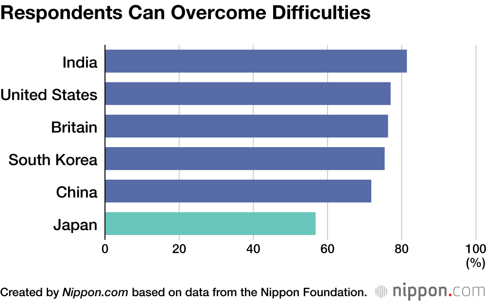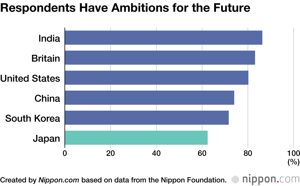 In a recent survey of 1,000 teenagers aged from 17 to 19 in each of six countries—Japan, the United States, Britain, China, South Korea, and India—the Nippon Foundation asked whether they held particular ambitions for the future. A total of 86.3% of respondents from India, 83.1% from Britain, and 80.2% from the United States answered either “yes” or “to some extent.” However, only 62.4% of respondents from Japan chose one of these answers.