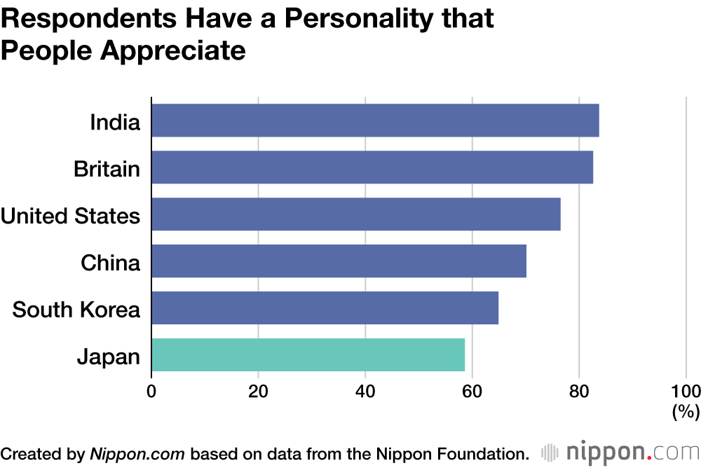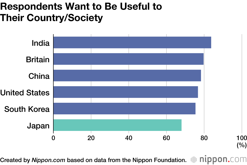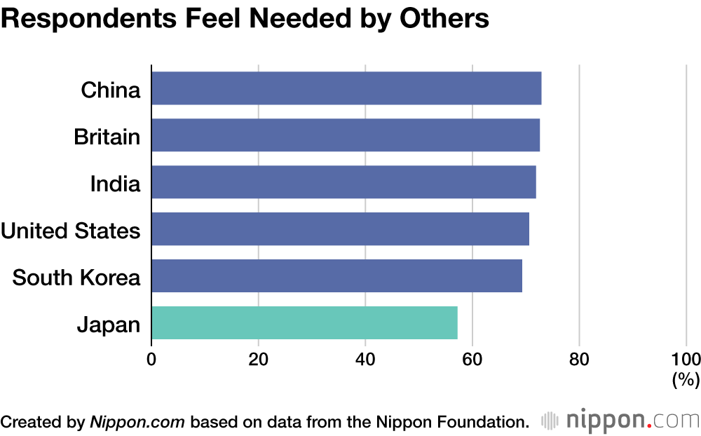 Fewer than 60% of Japanese agreed they “have a personality that people appreciate” and “feel needed by others,” the lowest response levels by far among all the countries surveyed. There was also a relatively low sentiment among Japanese respondents that they wanted to be useful to their country or society.