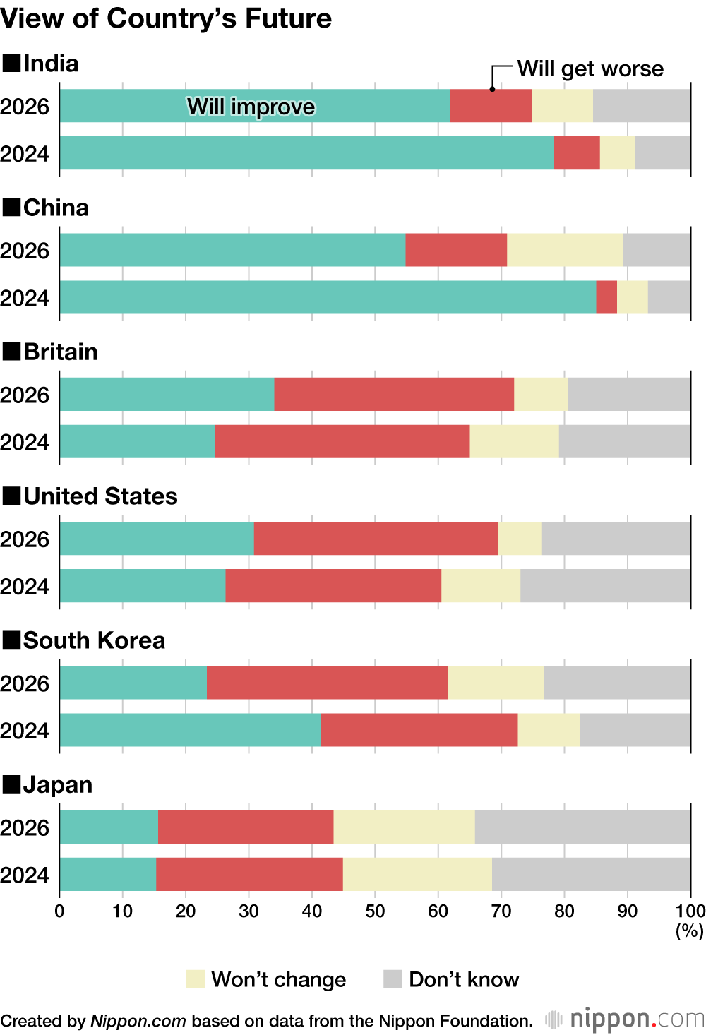 What do these teenagers think about their country’s future? In India and China, more than half think things will improve. While the percentages have dropped since the 2024 survey, people in these countries are more confident than those in others in the survey about life getting better.