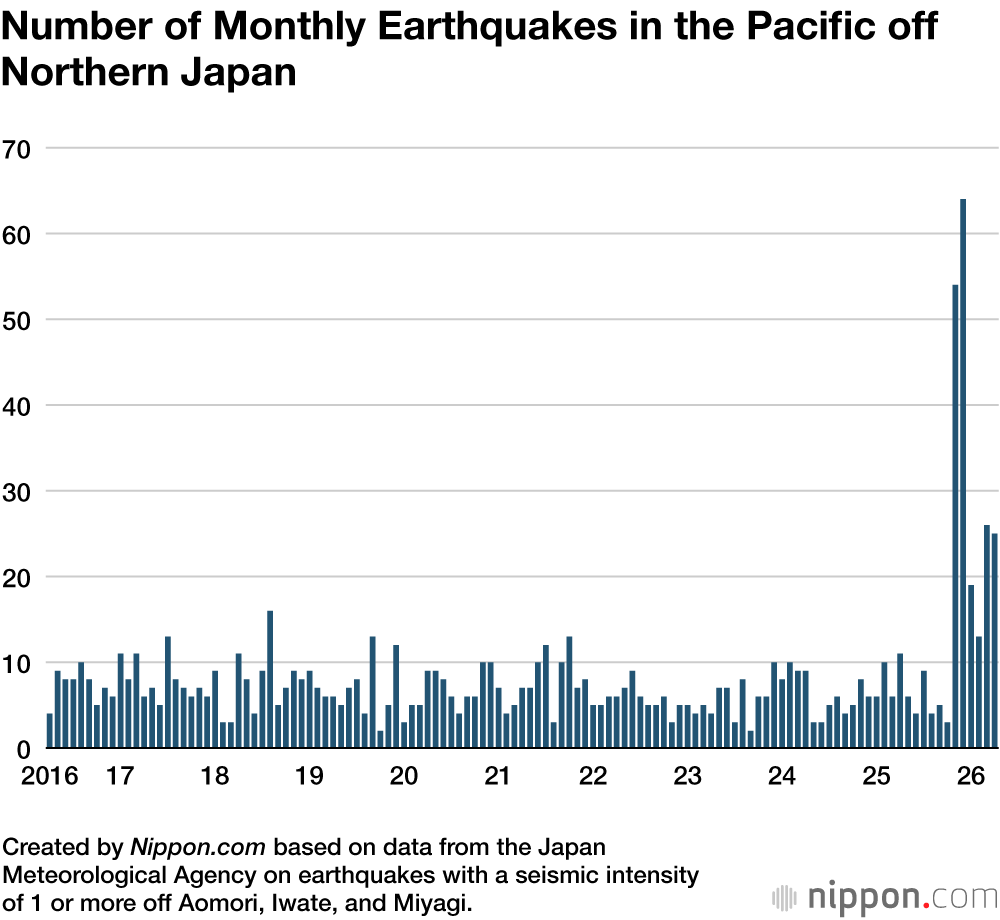 Data from the JMA shows a notable increase in the frequency of earthquakes in the region since November 2025. This is based on a comparison of the number of earthquakes with a seismic intensity of 1 or greater, centered in the sea off eastern Aomori, Iwate, and Miyagi Prefectures over the past 10 years.