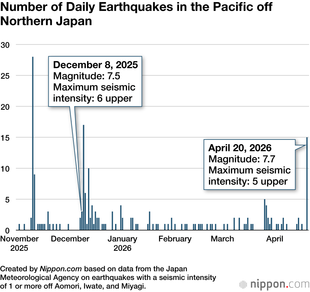 It includes the December 8, 2025, earthquake with a magnitude of 7.5 and seismic intensity of 6 upper, and the April 20, 2026, earthquake with a magnitude of 7.7.