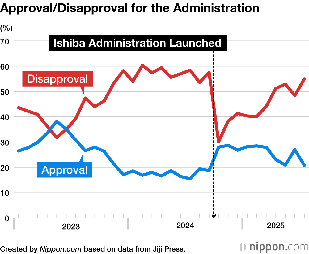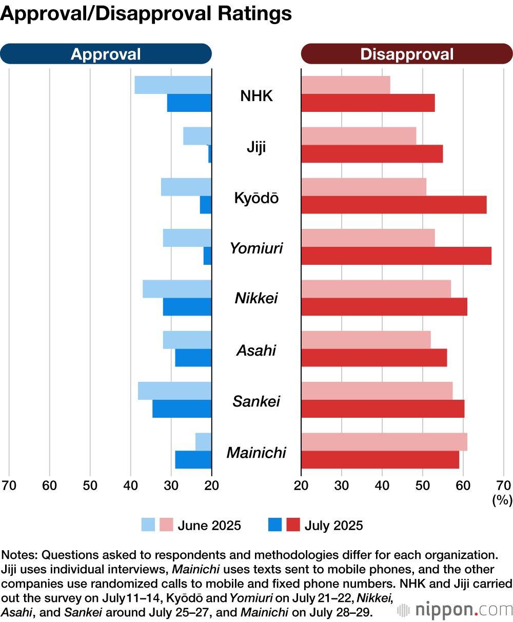 The nation’s main media organizations have released their results for public opinion surveys carried out in July 2025. This was a month that included a House of Councillors election that saw the ruling coalition of the Liberal Democratic Party and Kōmeitō lose its simple majority in the house. The survey results matched this bad news for Prime Minister Ishiba Shigeru, showing serious drops in the percentages of respondents approving of his administration.