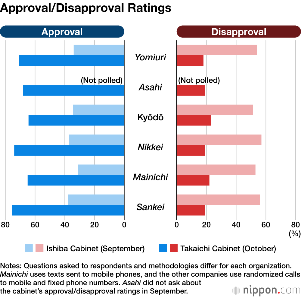 All the polling companies reported disapproval ratings for the new administration of around 20%, representing a drop of some 30 percentage points from the disapproval numbers earned by the administration of the previous prime minister, Ishiba Shigeru, toward the end of his term.