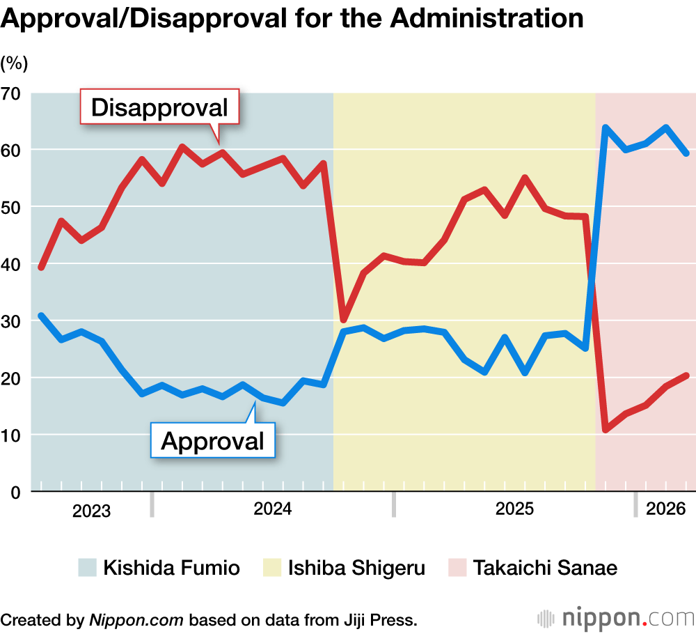 The Jiji Press polls over the five months Takaichi has been in power show that she has maintained a healthy support rate in the 60% range. This is around twice that of Ishiba Shigeru in October 2025, at the end of his time in office, and three times that of Kishida Fumio just before his administration came to an end in September 2024.
