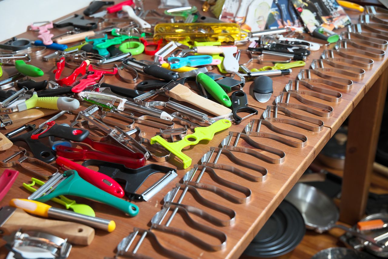 The sole function of a kitchen peeler may be to peel thin strips off of an ingredient, but customers can find around 100 different types stocked at Iidaya, a cooking goods emporium in the shopping district of Kappabashi, Tokyo.