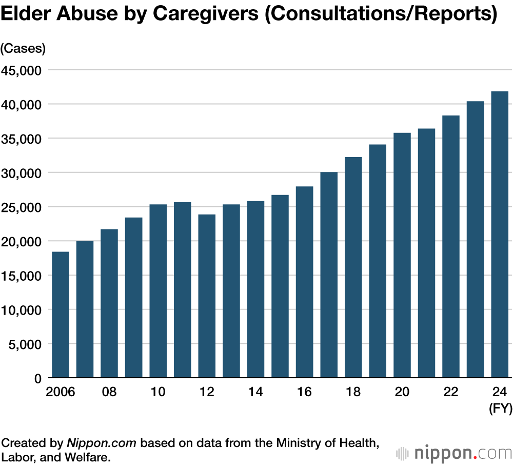 Caregiver isolation is a great source of stress and can lead to violence. According to a Ministry of Health, Labor, and Welfare survey, fiscal 2024 saw 41,814 consultations/reports regarding elder abuse at the hands of caregivers. The number has risen every year for the past 12 years, and is now at its highest since the survey began in 2006. There have been 26 fatalities in that time, as well.