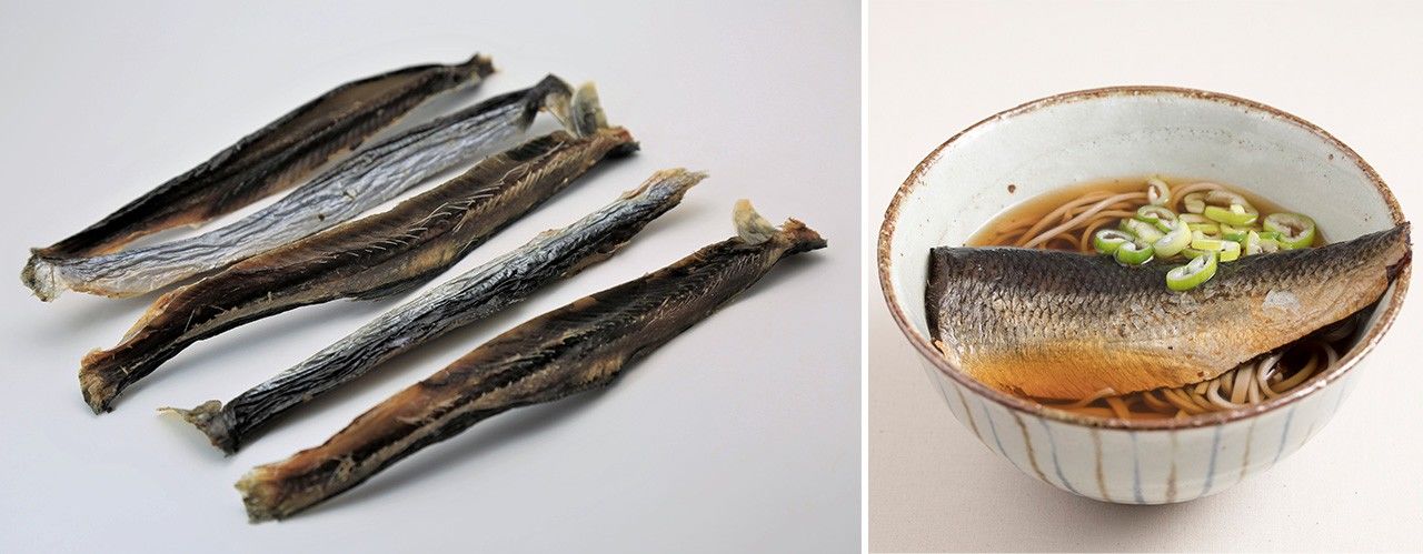 Migaki-nishin, on the left (© Pixta), and nishin soba from Hokkaidō, on the right. (Courtesy the Ministry of Agriculture, Forestry, and Fisheries)