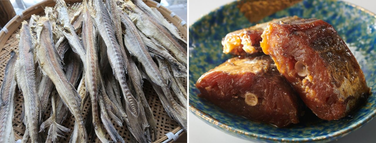 Bōdara on the left (© Pixta) and bōdara-ni, simmered cod, from Yamagata Prefecture, on the right. (Courtesy the Ministry of Agriculture, Forestry, and Fisheries)
