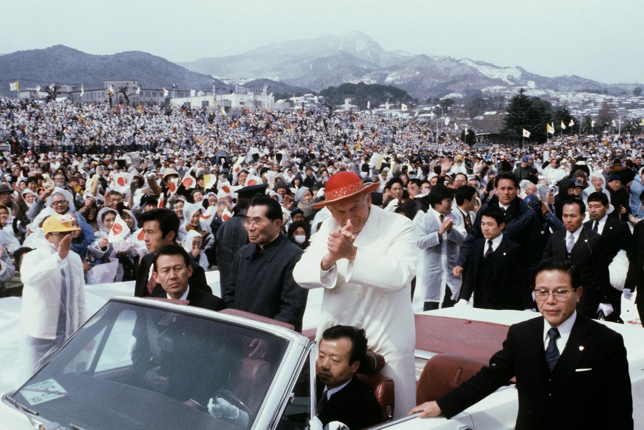 Pope John Paul II is greeted by crowds in Nagasaki on February 26, 1981. (© Jiji)